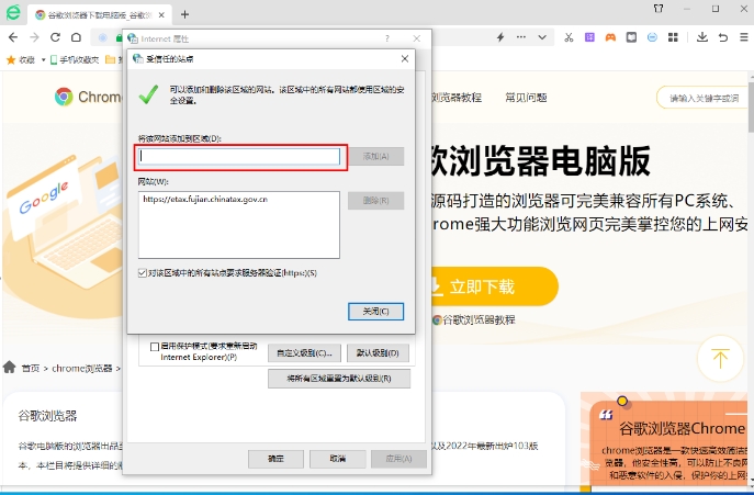 4、然后会打开一个名为“受信任的站点”的新窗口,允许你输入想要添加为信任站点的网址,设置完成即可。