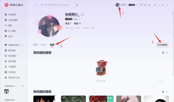 1.打开网易云音乐客户端,然后页面上方的个人头像,接着依次点击“播客”→“管理播客”按钮。