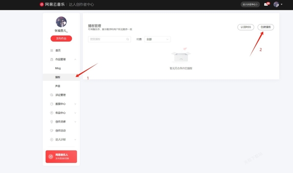 2.这样我们会来到达人创作者中心,在这里我们点击左侧功能栏里的“播客”功能,并点击“创建播客”按钮。
