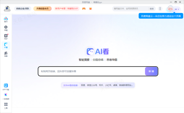 它是一款国人熟知的国产网盘软件,软件搭载了智能助理——云一朵,它是基于文心大模型打造的人工智能助理,可以帮助大家快速的搜索文件、处理文件、创作内容、智能聊天以及答疑解惑等,全面提升在工作、学习以及生活方面的使用体验。