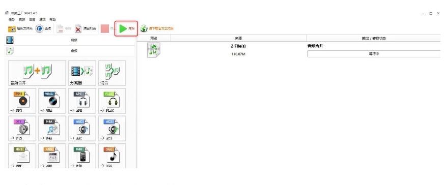 4、然后点击界面上的“开始”按钮,格式工厂将按照你添加的顺序将音频文件合并成一个文件。