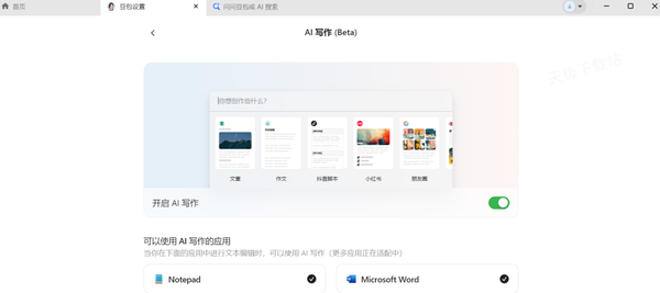 5.点击AI写作(Beta)。可开启或关闭电脑记事本和Word文档的窗口显示。