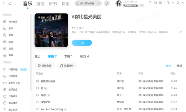 七月新出的电视剧《你比星光美丽》最近在网上可谓是大火,引发了广泛的关注和热议。这是一部由谭松韵、许凯主演的都市职场爱情剧,其扣人心弦的剧情以及与之相得益彰的插曲,让广大观众产生了强烈共鸣。不少人在看过《你比星光美丽》这部剧后,都对剧中的歌曲产生了浓厚兴趣并进行搜索。据小编调查,《你比星光美丽》全部歌曲可以在酷狗音乐、网易云音乐、QQ音乐上免费收听,共有7首歌曲,接下来天极小编就为大家详细介绍一下。