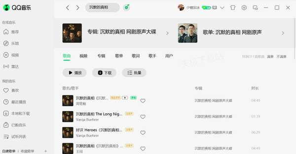 网剧《沉默的真相》近来火爆全网,它是由陈奕甫执导,廖凡、白宇、谭卓、宁理、黄尧等领衔主演的一部现代悬疑剧,其改编自紫金陈的小说《长夜难明》,主要讲述了检察官江阳为了查明真相、还给死者一个清白而努力拼搏的故事。这部剧之所以广受喜爱,其中的环境歌曲起到了极大的作用,那么这些歌曲能在哪里免费收听呢,下面由天极小编来为大家介绍一下。