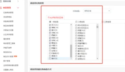 商家可以根据自己的需求,勾选限制购买的区域。这里提供了四级分类(如省级、市级、县级等),方便商家进行精细化的设置。商家还可以选择清空已有限购区域,使用新的限购区域;或者在已有限购区域基础上,增加新的限购区域;亦或从已有限购区域中取消指定的限购区域。