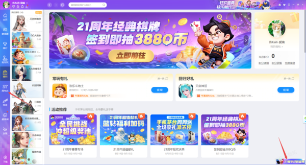 经调查发现,QQ游戏21周年狂欢庆典活动入口就在QQ游戏大厅电脑客户端中,启动软件登录自己的账号,然后软件就会弹窗21周年活动的窗口了,点击任意按钮即可进入活动界面。