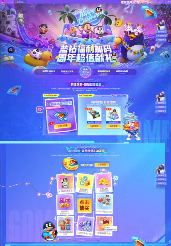 经调查发现,QQ游戏21周年庆典活动起止时间是8月15日至9月15日,同时本次庆典活动分为5个会场活动,包括21周年庆典主会场活动、棋牌年度好礼专场活动、蓝钻周边献礼专场活动、参赛冲冠军礼专场活动和页游Q币不断专场活动。
