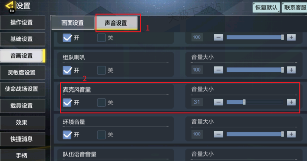 2.然后选择【声音设置】,在页面的下方找到【麦克风音量】,将其打开后,在右边设置音量。小编建议大家将【麦克风音量】和【组队喇叭】调到最大,其余音量可以适当降低,这样游戏沟通会更加清晰顺畅。