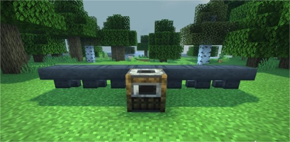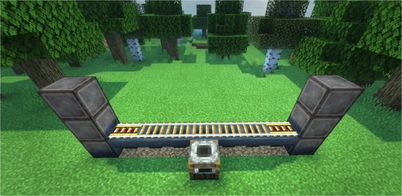注意铁轨的后方,如图所展示要摆放红石块和普通方块,然后在铁轨上放置漏斗矿车,然后推动,这时候漏斗矿车就可以不停的左右晃动了。