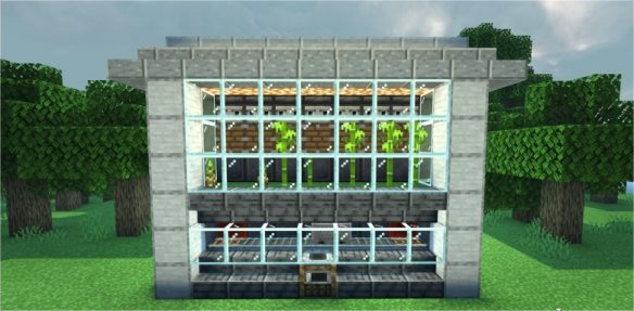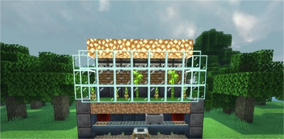 接下来需要在泥土上面种好竹子,然后用玻璃把种植的区域封闭起来,可以提供更多的光照和温度,然后在顶端再放置上萤石等光源方块,为它提供充足的光照。