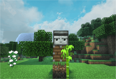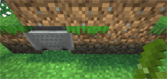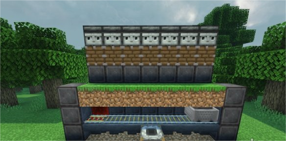 草方块的后方要根据图片所展示的那样依次进行摆放,分别是普通方块,普通活塞和侦测器。