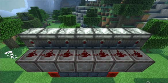 活塞的后方位置要再放一排普通的方块,在上面铺设好红石粉。