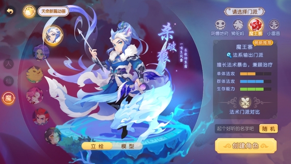 3、职业选择。对于刚入坑的新手玩家,这里推荐3个职业:对于人族可以选择倾向辅助的“化生寺”,仙族可以选择物理输出的“花果山”,魔族可以选择法术输出的“魔王寨”,这3个职业对应3个种族,都很适合新手,不至于说前期熟悉游戏的过程变得非常困难。