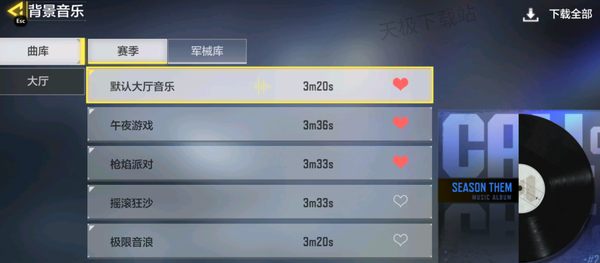 3.目前共有5首背景音乐,分别是默认大厅音乐、午夜游戏、枪焰派对、摇滚狂沙、极限音浪,在喜欢的音乐后面点击红心。