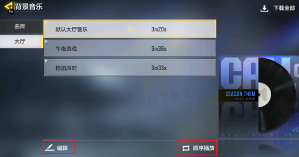 4.切换到【大厅】,点击左下角编辑可以调整背景音乐的播放顺序,右下角则可以在【随机播放】和【顺序播放】之间切换。