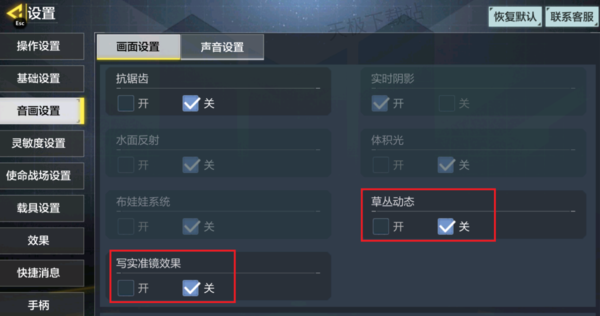 2.往下在战场画面设置中,将【草丛动态】和【写实准镜效果】关闭。