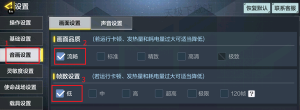 1.在设置界面,点击左侧【音画设置】,将画面品质设为【流畅】,帧数设为【低】。