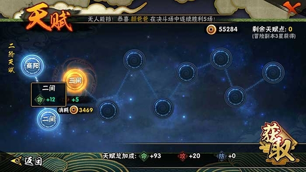 1,在图中我们能够看到一个蛇形的天赋树,这个是二阶天赋,也就是说用户已经把一阶天赋树全部点满了,这里强化的就是新一轮的二阶天赋树,天赋系统是让用户通过额外增加属性来强化忍者角色的方法,也是更有效的途径,更关键的是使用天赋强化系统不仅仅是强化其中一个忍者,而是所有的忍者都可以从这里得到效果增强。