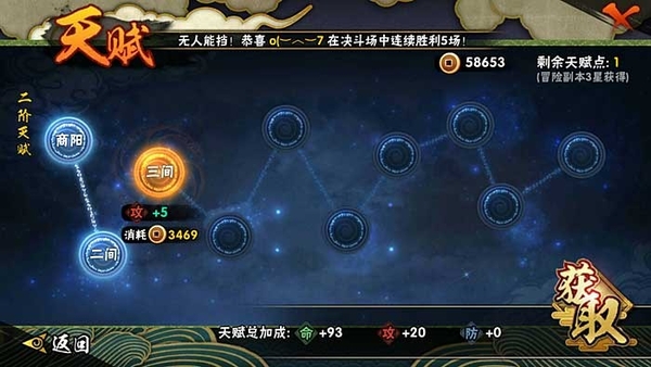 4,图中我们能够看出来前5个天赋点可以给我们带来的效果分别是攻击加3点,生命加12点,攻击加5点,防御加2点,生命加20点,所以说天赋给玩家的忍者带来的加成效果还是很明显的,这样的数值累积起来在一个阶内的天赋加成相当于一整套装备给我们带来的属性加成,所以大家还是要积极的去完善自己的天赋系统。