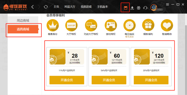 在电脑上打开悟饭游戏厅后,登录一个自己的账号,选择主页面上方的商城图标。跳转带悟饭游戏厅商店之后,选择道具商城,就能看到会员中心了。在会员中心,有三种不同金额与时间的会员可选,点击对应选项中的开通会员,就能跳转到支付界面,支付完成之后,会员就开通好了。