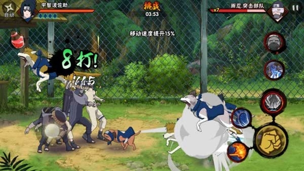 忍犬大军:卡卡西的忍犬协助玩家撞向对方,造成460%的伤害值,当出现忍犬后,整个小队的成员移动速度将提高15%,持续时间也是15秒。