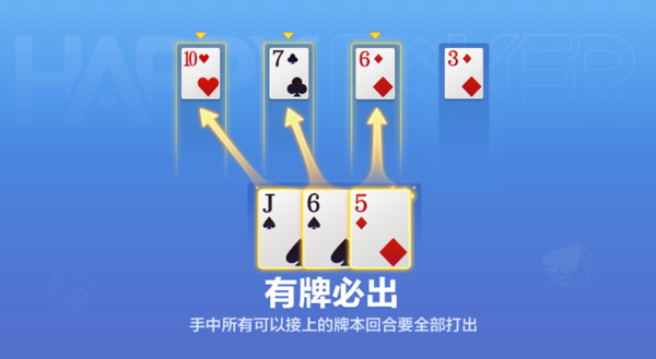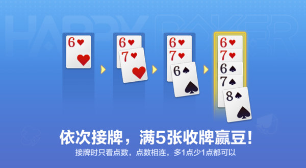 这种玩法需要三名玩家共同参与,需要一副扑克牌即可,但是要去掉大小王,并加上4个万能的赖子牌,一共56张。玩家要依次接牌,也就是把符合规则的手牌全部打出去。在接牌时只需要点数相连,无论是多一点还是少一点都可以出牌,当玩家累积5张的时候就可以收牌赢取欢乐豆了。