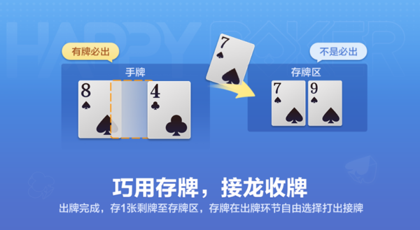 当一个回合结束之后,如果手牌还有空余牌,需要存一张牌到存牌区,存牌区的牌不是必须要出的,其他的玩家可以看见存牌区的牌型,当轮到自己回合出牌时,可以当做手牌来自由选择打出与否,我们要巧妙的利用存牌区的牌进行接龙收牌,这样才能更容易赢到欢乐豆。