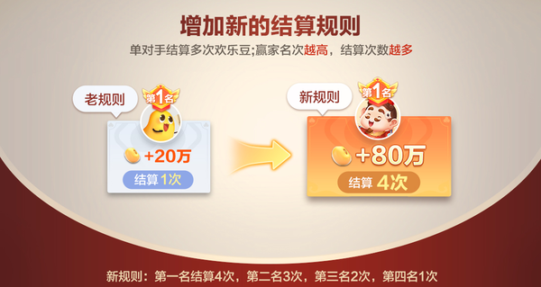 这个规则也就彻底告别了只能够结算一次欢乐豆的规则,让玩家能够拥有多次结算欢乐豆的畅爽体验。获胜者的名次越高,结算的次数也就越多。游戏的第一名可以结算4次,依次顺延,第二名是3次结算次数,这种规则会让玩家勇争第一,你是否有心动的感觉呢。
