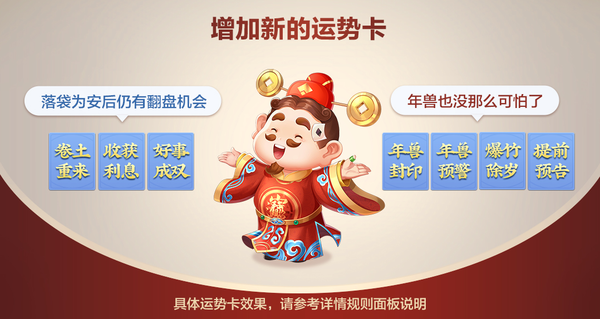 恭喜发财步步为赢玩法共9种运势卡,玩家选择“落袋为安”后仍有翻盘的可能,还有多张专门针对年兽的运势卡,年兽风险更小,就不再那么可怕啦。