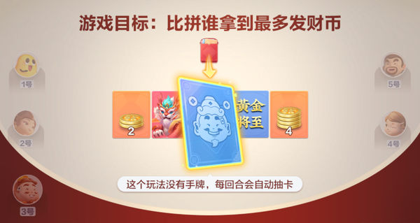 一,这个玩法其实就是在考验哪个玩家能够获得更多发财币,对局时获得的发财币越多,在结算时赢得的豆子也就越多。这个玩法一共需要5名玩家同时参与,没有手牌,每一回合游戏系统会从牌堆里面随机抽出一个事件卡。5名玩家大部分的事件卡都会让玩家的发财币增加。