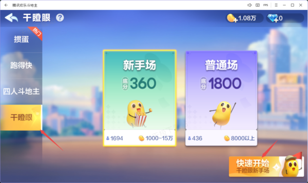 然后,在左侧的列表中大家就可以看到【干瞪眼】玩法了,选择它,接着,点击右下角的【快速开始】按钮