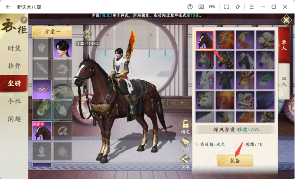 3、接着,在右侧的坐骑选项中,勾选已解锁的坐骑,然后点击下面的【装备】按钮即可使用坐骑。