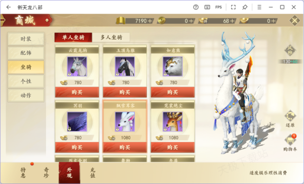 1、玩家在游戏中赚取元宝,然后在商店中可以直接购买坐骑。
