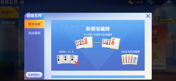 1.6至2每个点数都由原来的4张增加至5张,其中新增的1张为“宝藏牌”,小王、大王分别有2张,且4张王牌均为“宝藏牌”,对局中无点数为3,4,5的牌。