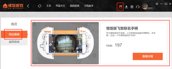 现在市面上的大多数手柄,都是可以在悟饭游戏厅上使用的,但是想要完美的匹配好,可以购买一个专门为悟饭游戏厅定制的手柄。在悟饭游戏厅主页面,点击商城图标,在周边商城选项中就有这类产品。