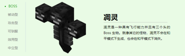 在我的世界中,凋灵是一种能飞行的,有三个头的Boss级生物。凋灵虽然是亡灵生物,但不会在阳光下自燃,也不会受到火焰以及岩浆伤害。在和平模式下,不会产生凋灵,不想在游戏中遇到凋灵的可以选择该模式。