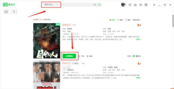 首先,目中无人这部电影是可以在爱奇艺上看到的,并且,爱奇艺有目中无人的独播权的,所以我们只需要打开爱奇艺客户端,在上面的搜索框中输入“目中无人”,按下回车键,然后点击“立即播放”就可以找到这部电影来看了。