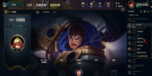 首先打开英雄联盟并登录进入到主页面后,点击右边的好友列表,找到想要查看资料的玩家并点击它鼠标右键查看生涯就可以看到玩家详细的资料了;