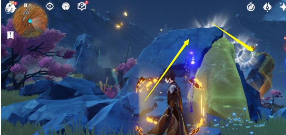 4、点击下落攻击岩柱产生共振,共振将山地洞口震碎打开