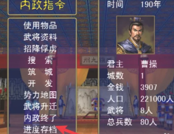 1、在游戏中,当进行到一定阶段,如完成一场战斗或进入城池后,会进入内政界面,在内政界面中,点击“进度存档”选项。