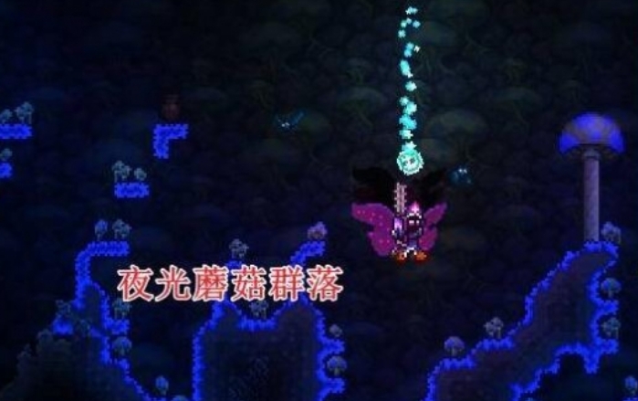 进入泰拉瑞亚世界的地下区域,寻找发光蘑菇群落。这些群落通常位于地下较深的洞穴中,环境昏暗,背景有蘑菇生长。