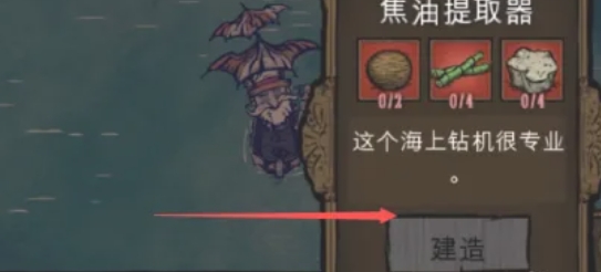 焦油提取器只能建造在漂浮的焦油上方,且需要消耗燃料才能工作。漂浮的焦油是随机生成的,因此可能需要多次出海探索才能找到。