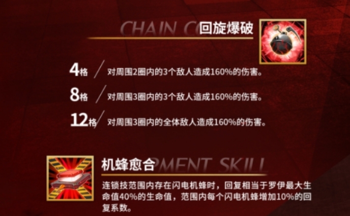 连锁技能:罗伊的连锁技能在范围内存在闪电机蜂时,能够回复自身生命值,并且每个闪电机蜂都会增加回复系数。这使得罗伊在战斗中不仅能够提供转色支持,还能够为自身提供一定的生存能力。