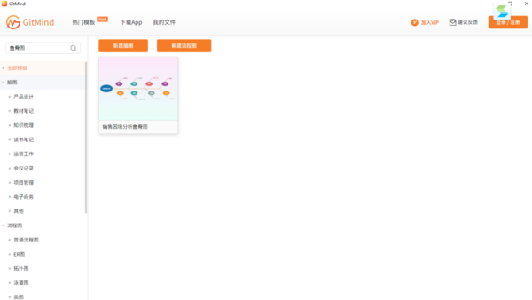 GitMind也是一款专业的脑图制作软件,其中就包含我们需要用到的鱼骨图,鱼骨图在GitMind中可以轻松被制作出来,搜索鱼骨图就可以找到相关的模板,点击后我们将里面的内容替换修改成自己需要的内容就可以了。