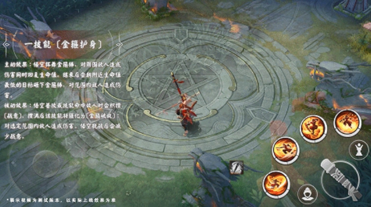 被动效果:悟空的普攻或技能命中敌人时会积攒“战意”。当战意攒满后,金箍护身技能将强化为金箍破敌,对选定范围内的敌人造成更高伤害。