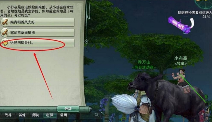 4.最后再找到NPC小布高对话,点击“送我回稻香村”就能回到稻香村了。