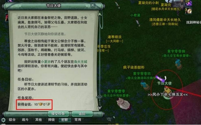 2.进入主城后,去活动区寻找地图NPC节日大使,领取清明时节雨纷纷任务。