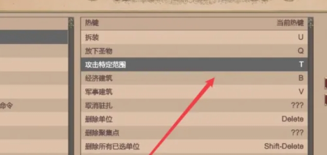 在热键设置界面中,你会看到一个包含多个游戏功能的列表。这些功能可能包括游戏命令、村民建设、部队命令等。