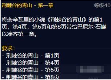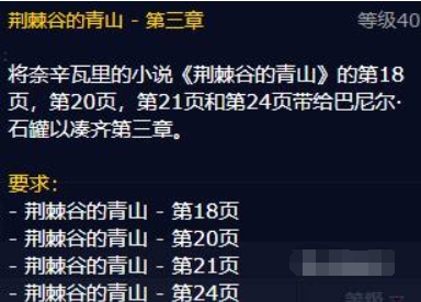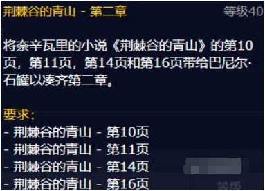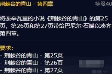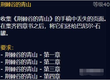 魔兽世界游戏中,荆棘谷的青山是荆棘谷区域非常经典的任务,一共有四章,每一章需要的页都不同。