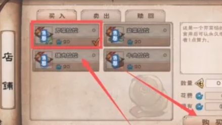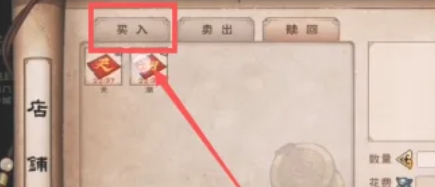 进入店铺界面后,浏览可购买的商品列表。虽然实际中可能不会有韭菜饺子出售,但此处假设有类似商品可供选择。点击“买入”按钮以进入购买流程。
